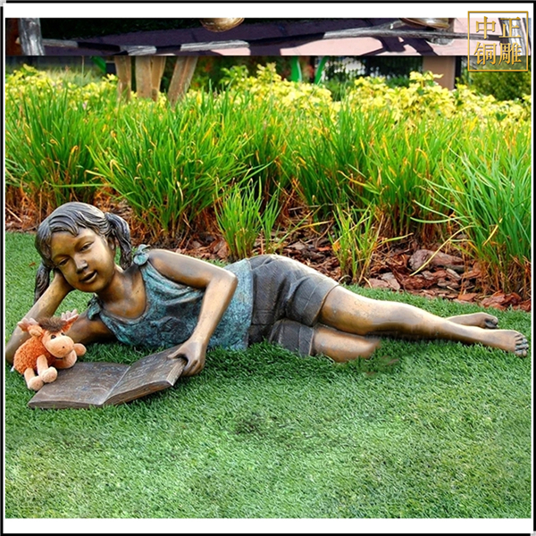 躺草坪上看書小女孩銅雕塑