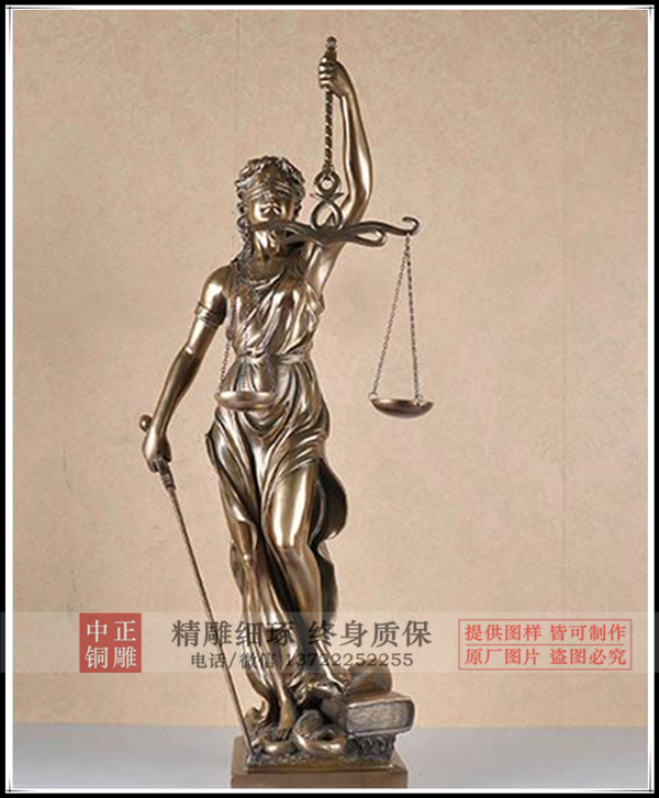 根據古希臘傳說:天庭上的眾神之間出現了矛盾和沖突,世界因此處于災難的邊緣。由誰來裁判眾神之間的矛盾?血氣方剛的容易受到水仙女的引誘,老于世故的卻不敢仗義執言,天上地下找遍了,最終也沒有找到合適的人選。最后,天帝身旁站起一位白袍金冠的女神,拿出一條手巾,蒙在自己眼睛上,說:我來!眾神一看,不得不點頭同意:她既然蒙住了雙眼,看不見爭紛者的面貌身份,也就不會受到誘惑和威脅。