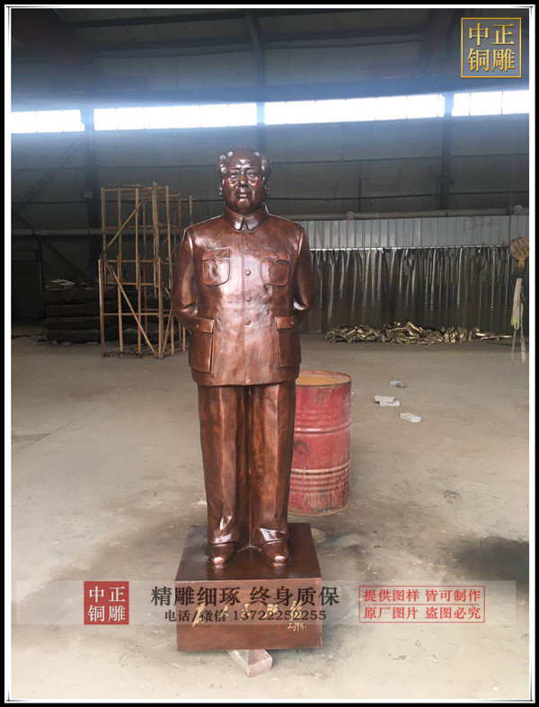 毛主席人物雕塑像面朝東南方,身著中山裝,左胸前掛著“主席”證,手執文稿,目光炯炯,面帶微笑,正視前方,巍然挺立,成功地再現了人民領袖毛澤東出席開國大典時的風采。