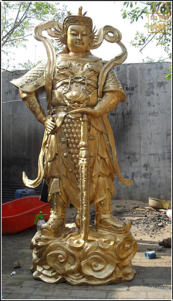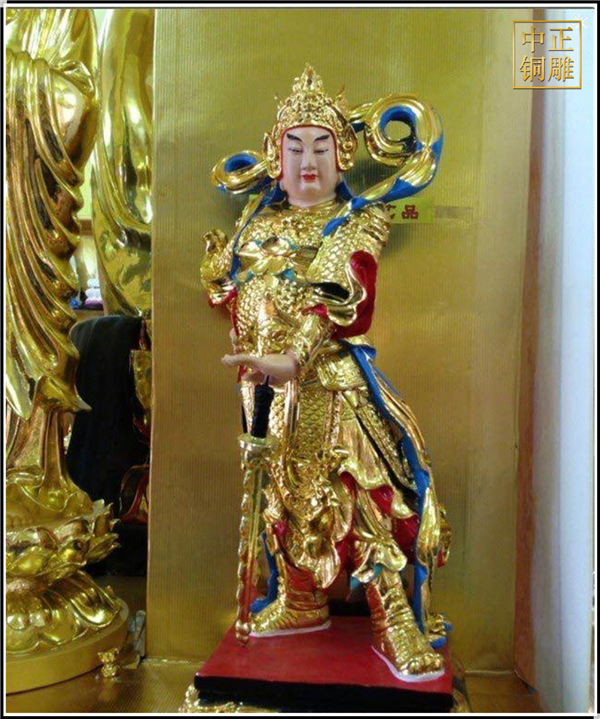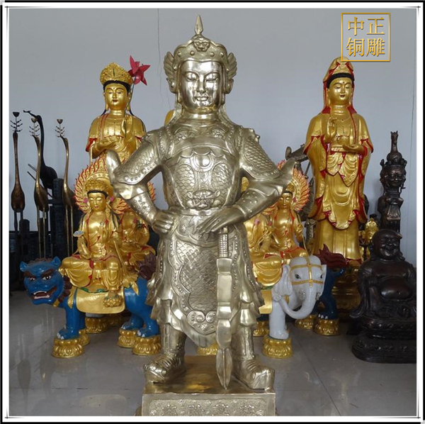 于是,韋陀被人們稱為護法菩薩。在中國的寺院殿宇里原印度血統的銅雕佛像韋陀已經漢化了,成了一名地道的中國武將,英俊威武。他身披鎧甲,手持金剛杵,降魔去妖,威風凜凜。天王殿中所塑的韋陀,一般具有兩種站立的姿態,一個是雙手合十,橫杵于腕上,直挺而立;一個是一手握杵拄地,另一手叉腰。