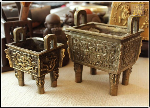 關于“鼎”的來歷及作用:鼎本來是古代的烹飪之器,相當于現在的鍋,用以燉煮和盛放魚肉。許慎在《說文解字》里說:“鼎,三足兩耳,和五味之寶器也。”有三足圓鼎,也有四足方鼎。最早的鼎是黏土燒制的陶鼎,后來又有了用青銅鑄造的銅鼎。