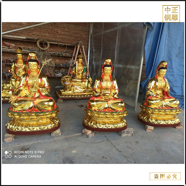 第六,表面工藝處理:一般佛像都是需要進行表面處理工藝的,一個是讓表面看上去更美觀,讓佛像看上去更真實;另一個就是掩蓋生產過程產生的沙眼和焊接等粗糙部位。表面處理工藝主要包含熱著色工藝、貼金箔、彩繪、鍍金、鎏金等幾類,還有一些局部處理工藝等等。