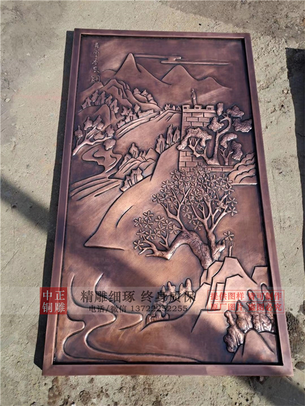銅浮雕又是中國古文化藝術,在引進歐洲先進工藝和先進技術,經過長期攻關和研究在國內首家研制開發(fā)生產的高級紫銅工藝品,以不脫色、不銹蝕的優(yōu)質紫銅為原料,經過多道工序精制而成,在形式上和內容上與地方特色文化緊密結合,具有立體感強、風格古樸、做工精細、形象逼真、畫面栩栩如生、可永久收藏等特點。中正銅雕-風水山水畫浮雕,加工風水山水畫浮雕,定做風水山水畫浮雕,我廠是自產自銷,中間無需過手,價格合理,承接貴單位來樣定制,并幫助設計策劃圖案,歡迎各大新老客戶前來咨詢、選購!