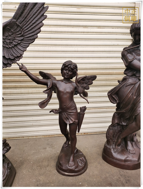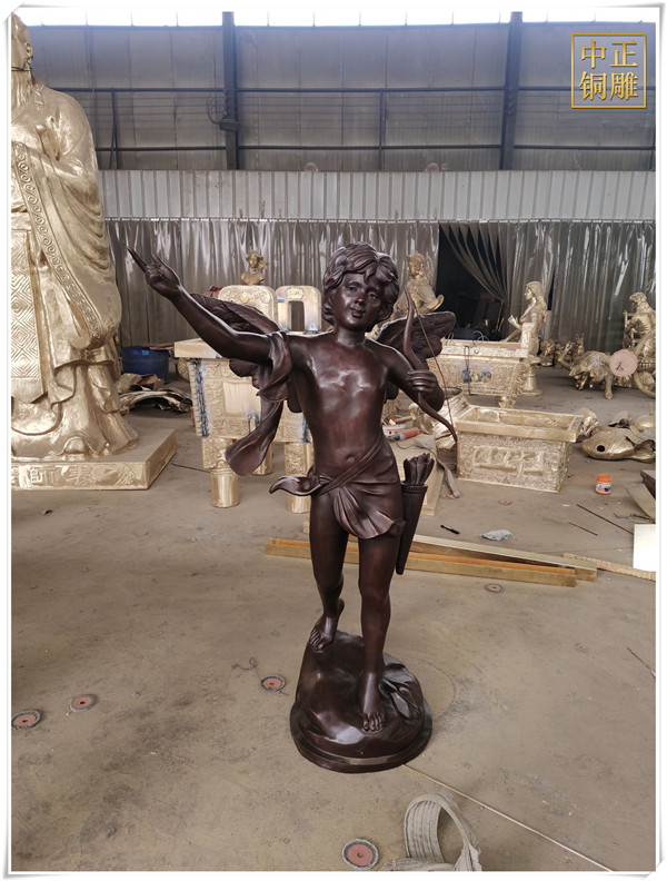 在中西方雕塑思維模式發展過程中,西方的雕塑文化形成了重視邏輯思維推理的模式,它結合了古希臘的科學主義和理想主義,為雕塑藝術的典范起到重要的基礎,中國的雕塑文化則形成了強調直觀意向的思維方式,它通過直覺來直接體驗、感悟并把握對象,這種思維方式超越了邏輯、概念而更長與悟性。中正銅雕-天使丘比特銅雕塑價格,天使丘比特銅雕塑圖片,天使丘比特銅雕塑批發,中正銅雕廠制作的天使丘比特銅雕塑高1.5米,我廠主營各種銅雕塑制作,包含人物雕塑、動物雕塑、銅佛像、銅鐘等等,制作工藝精湛、做工精細,質優價廉,是你選擇訂購銅雕廠家不錯的選擇。
