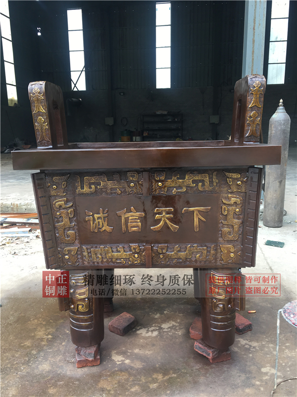 鼎傳承久遠,又地位極高。在《國家寶藏》節目中,現藏于上海博物館的大克鼎作為“鼎”中好物曾全面展示,讓人看了震撼不已,它不僅代表著古時候鑄鼎工藝的高度發達,又承載著中國五千年文明的文化基因,雖然只是一個用于祭祀的青銅鼎,但其底蘊傳承和文物價值不可估量。中正銅雕-銅鼎現貨價格,定做銅鼎現貨價格,加工銅鼎現貨價格,我廠設計制作銅雕藝術雕塑、大型銅雕城市雕塑、銅雕廣場雕塑,古建寺廟銅佛像,銅浮雕,銅雕鼎等,我們具有優越的地理位置,離107國道10公里,離天津海港160公里,交通便利。公司產品樣式眾多,歡迎您來圖來樣加工和訂做,本公司全體員工熱情迎接您的到來!